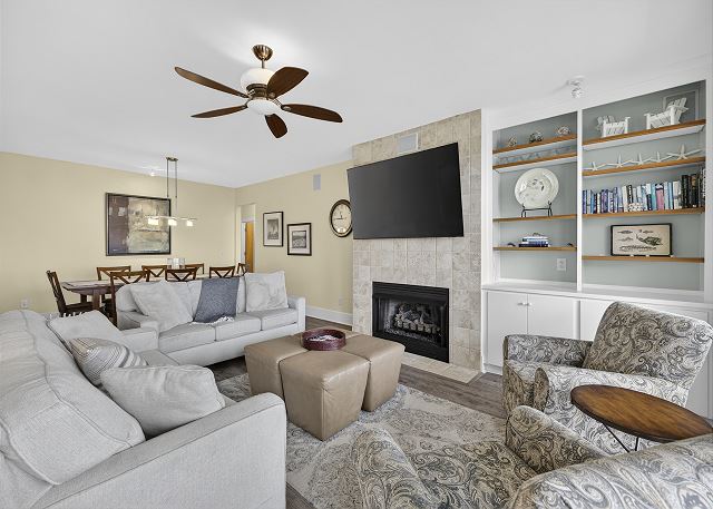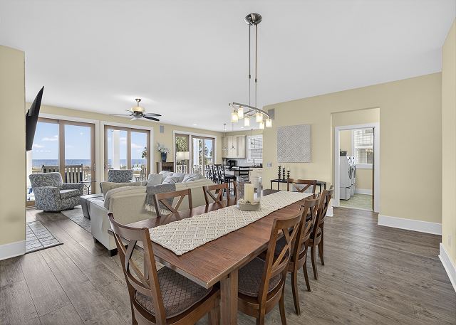 This 2,036 sq ft main-level home (in a duplex-style building with one unit above) features an open concept layout perfect for gathering. The dining area flows into a comfortable living room with a fireplace and a fully equipped kitchen with a breakfast bar island. Sliding glass doors span the entire oceanfront, filling the space with natural light and panoramic beach views, and opening directly onto your private deck overlooking the shoreline, morning coffee and sunset cocktails highly encouraged.