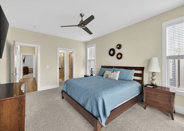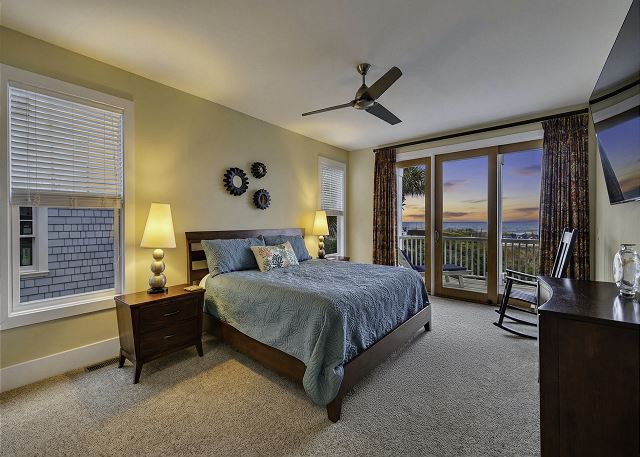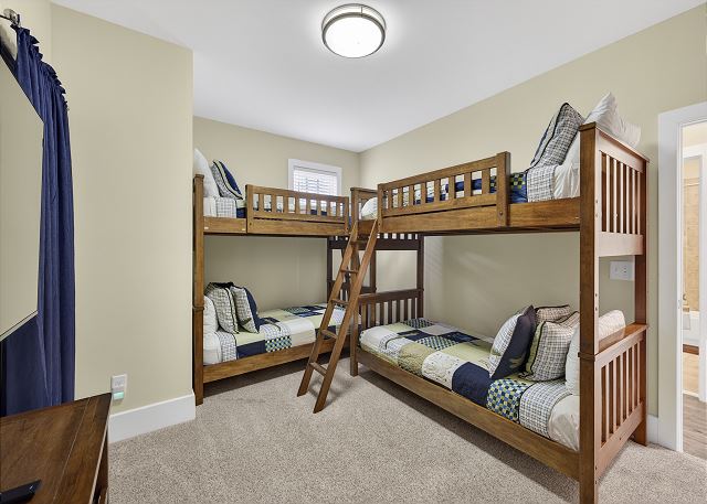 The primary suite offers ocean views, direct deck access, and a private bathroom with a tiled shower. The home also includes a king bedroom, a bunk room with four twin beds, and a fourth bedroom with two queen beds. Two additional full bathrooms and a laundry room provide added convenience, and every bedroom has its own smart TV.