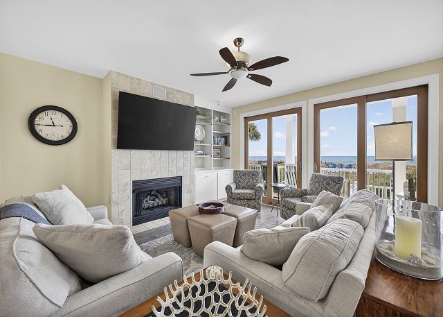 The 2,036 sq ft main-level home (in a duplex-style building with one unit above) features an open concept layout perfect for gathering. The dining area flows into a comfortable living room with a fireplace and a fully equipped kitchen with a breakfast bar island. Sliding glass doors span the entire oceanfront, filling the space with natural light and panoramic beach views, and opening directly onto your private deck overlooking the shoreline, morning coffee and sunset cocktails highly encouraged.